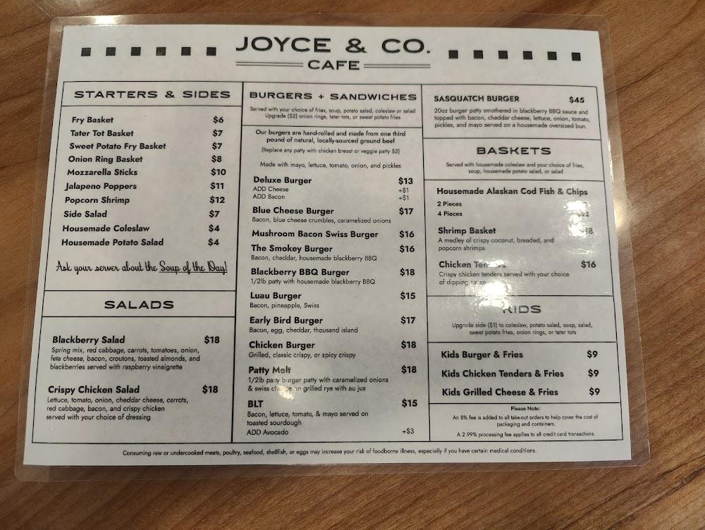 Welcome to Joyce & Co. Cafe, your go-to spot in Port Angeles for homestyle breakfasts, lunches, and dinners, featuring a cozy drive-thru coffee option. Formerly known as Blackberry Cafe, we proudly serve delicious, locally-inspired cuisine in a charming, friendly atmosphere. Enjoy our inviting terrace and quick service while savoring excellent coffee and delectable desserts. Open 7 days a week, we cater to all with accessible facilities and a relaxed ambiance perfect for solo diners or family gatherings. Join us at 50530 WA-112 for a delightful meal that captures the essence of small-town charm.